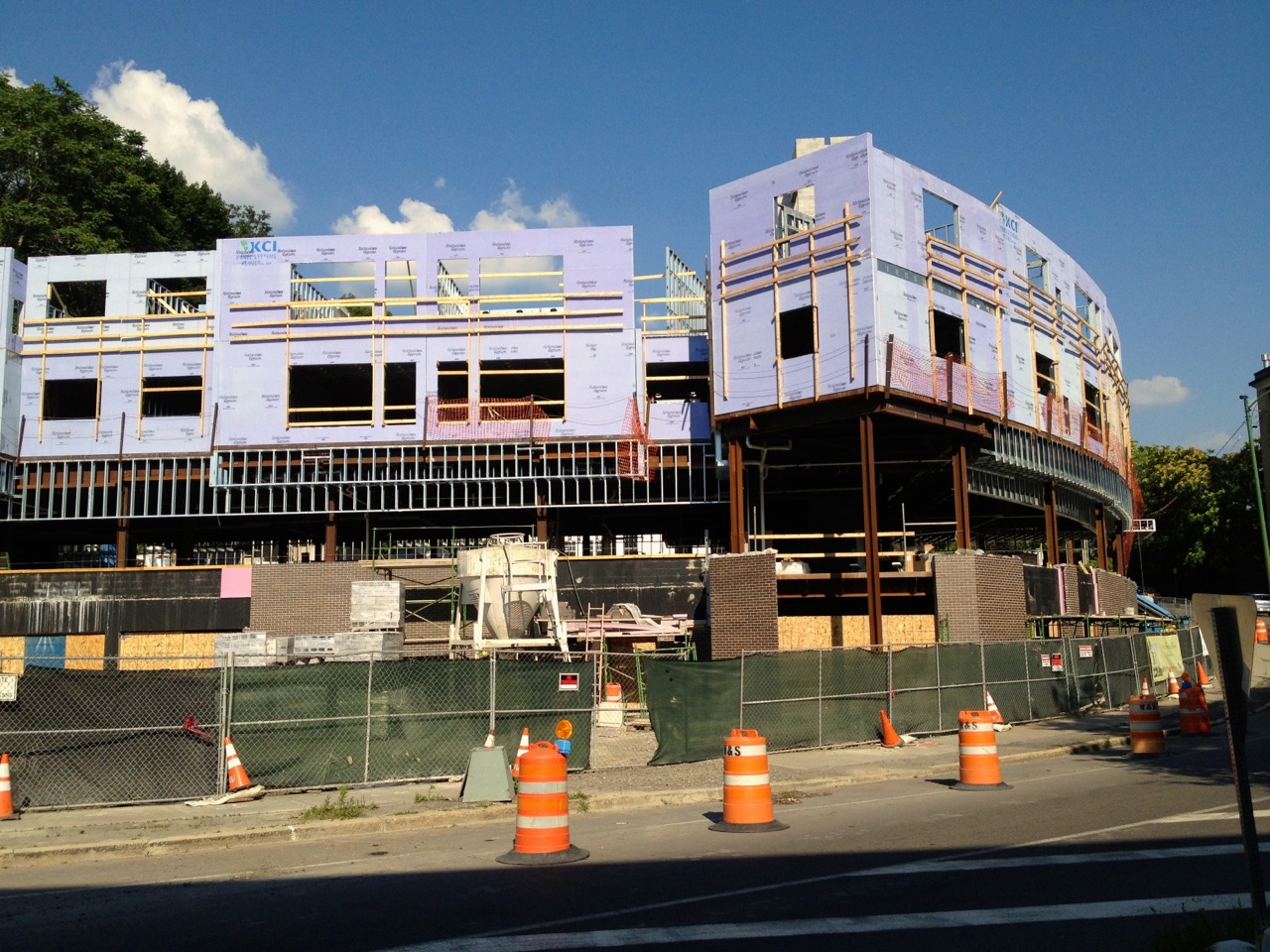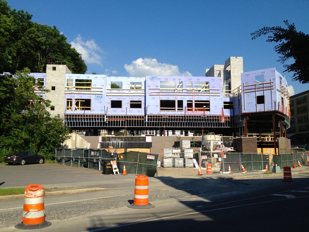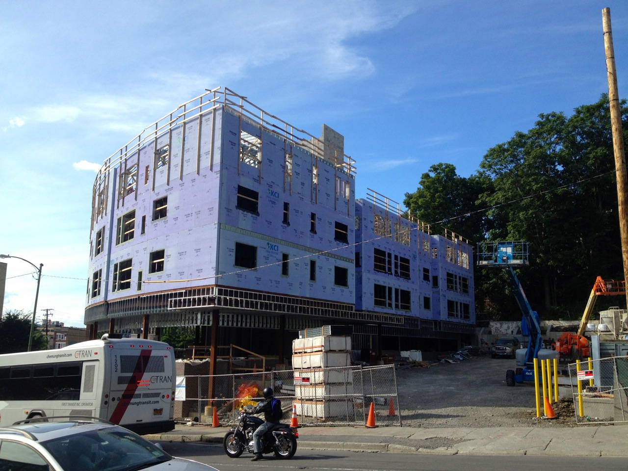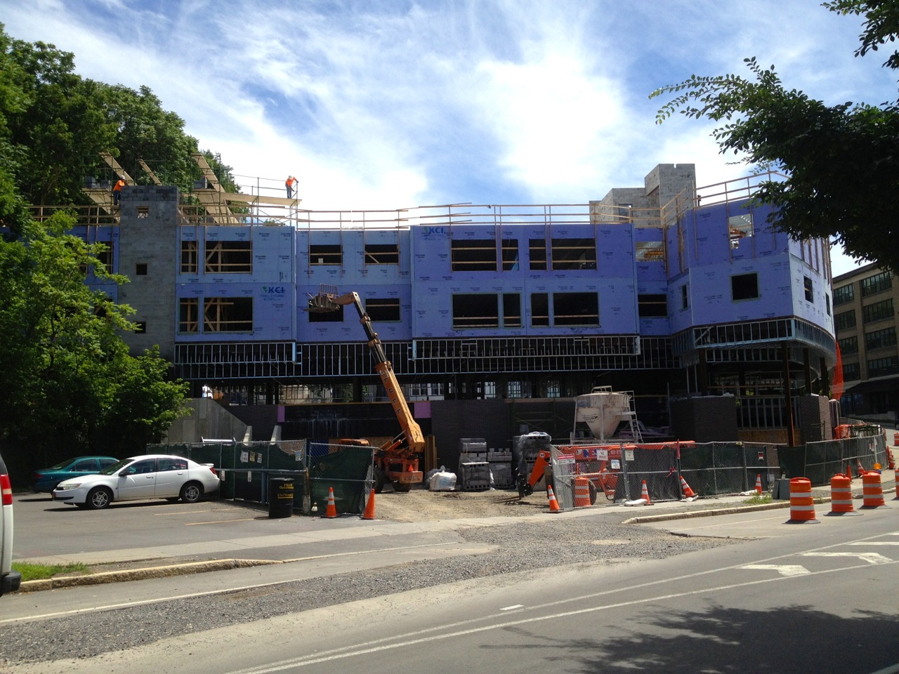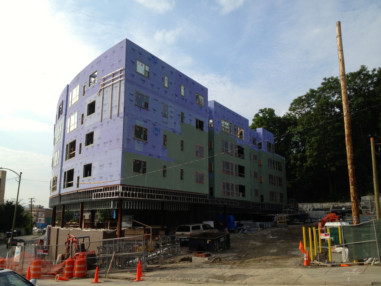 Seneca Way’s EIFS (Exterior insulation finishing system) facade is going up quickly, as you can see the eastern side is nearly complete, and the southern side is progressing nicely. With some more fine weather on tap for next week, I doubt this part of the project will take longer than expected. The posts with flags on the roof makes me think there’s material going up there as well, I’d bet a membrane EPDM (ethylene propylene diene monomer, lots of four-letter acronyms here). If you haven’t seen it yet, check out the website for Seneca Way, which contains full information on the amenities and floor plans.